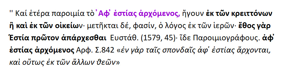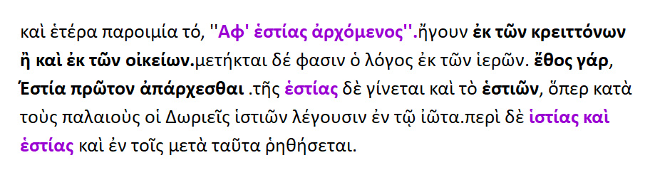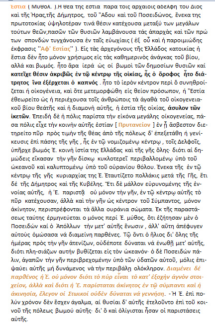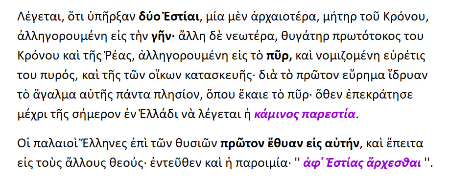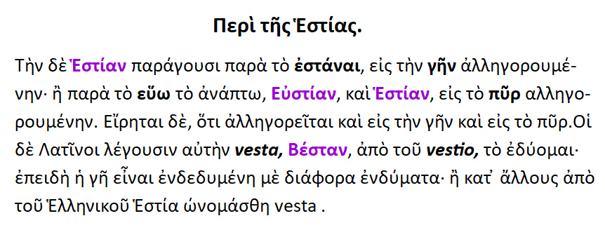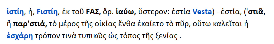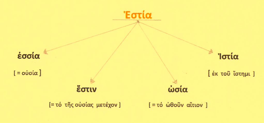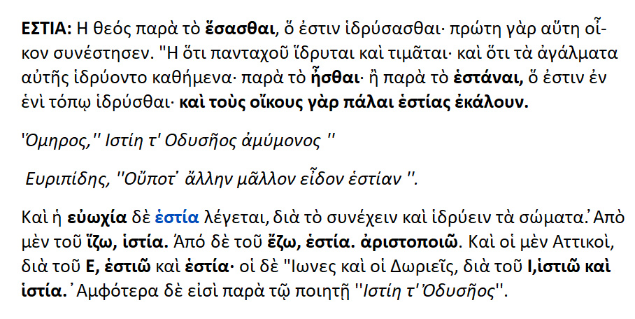 Η θεά Εστία { < έσασθαι = ιδρύσασθαι }.Διότι πρώτη αυτή επινόησε την κατασκευή του οίκου. Ή επειδή παντού ευρίσκεται και τιμάται, και λόγω του ότι τοποθετούσαν τα αγάλματά της καθήμενα [ σε καθιστή θέση ]. Εστία από το ήσθαι ή το εστάναι, όπερ σημαίνει ,το ότι έχει εγκαθιδρυθεί εντός κάποιου τόπου.Διότι και τους οίκους το πάλαι έλεγαν εστίες. Ευωχία λέγεται και η εστία ,επειδή η ευωχία συνέχει και καθίζει τα σώματα. Η εστία / ιστίη ετυμολογείται από το μεν ίζω > ιστία από δε το έζω > εστία. Από αυτό και το εστιώ ,το αριστοποιώ.