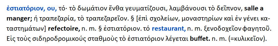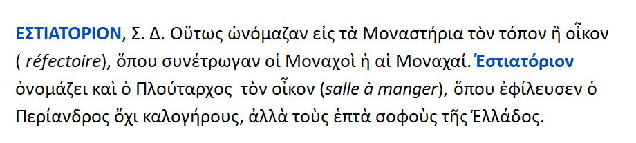 Réfectoire { < Refectorium- ii = εστιατόριον [κοινοβίου ], μεταγενέστερη λέξη } : Έτσι στα μοναστήρια ονόμαζαν τον τόπον ή τον οίκον { =réfectoire } ,όπου συνέτρωγαν οι Μοναχοί ή οι Μοναχές . Eστιατόριον ονομάζει ο Πλούταρχος τον οίκον {= salle a manger } ,όπου φίλευσε ο Περίανδρος [ τύραννος της Κορίνθου ] όχι βεβαίως καλογήρους , αλλά τους επτά σοφούς της Ελλάδος .