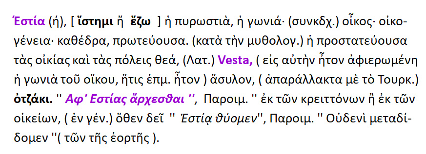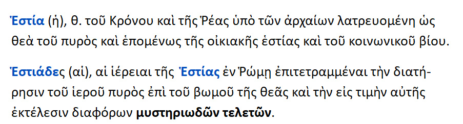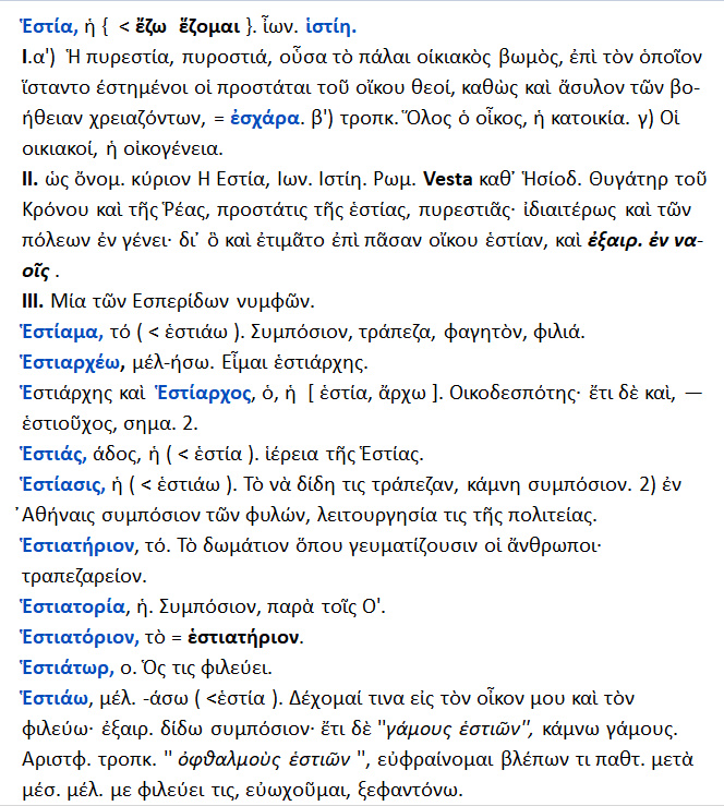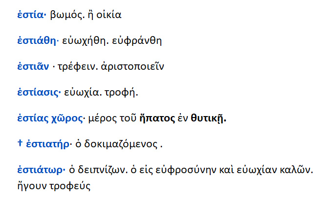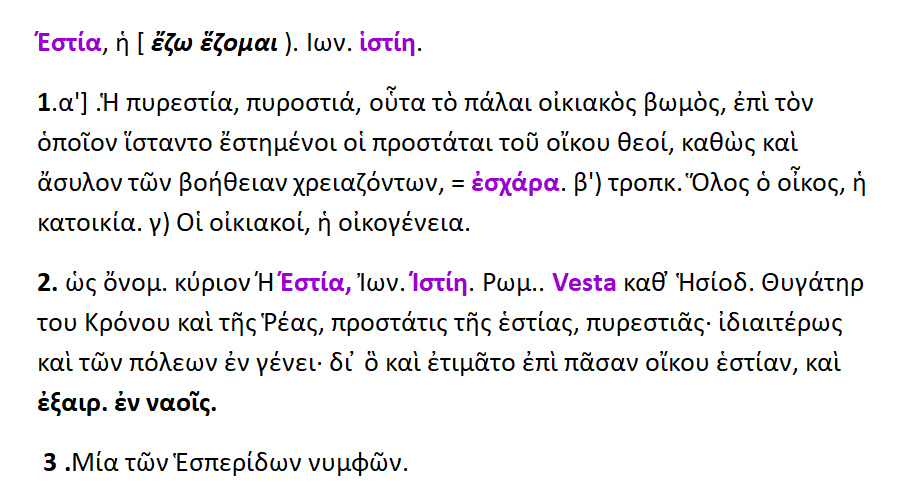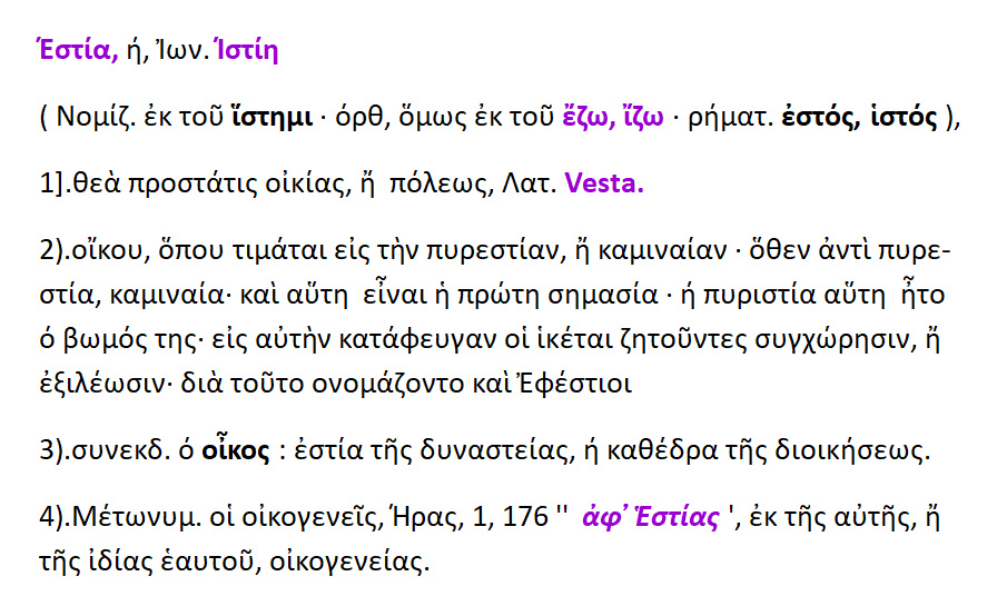 Εστία / Ιστίη { Vesta } : θυγατέρα του Κρόνου και της Ρέας ,προστάτης της οικογενειακής εστίας ,του οίκου , της οικογενείας. Αυτήν επικαλούντο πρώτη κατά τις εορτές. Εστία ,ιστίη { < έζομαι } : η εστία της οικίας ,το μέρος ,που ανάβουν φωτιά, γωνιά ,τζάκι // ,όθεν θυσιαστήριο ,βωμός 2. κατοικία. 3.οίκος ,οικογένεια.