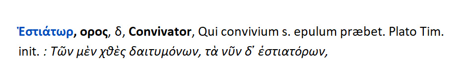Εστιάτωρ { convivator } = όποιος παρέχει συμπόσιον, ευωχία στους άλλους.