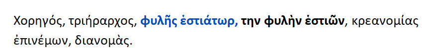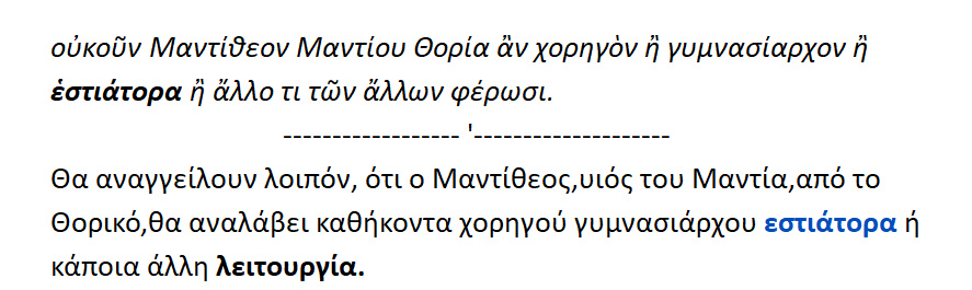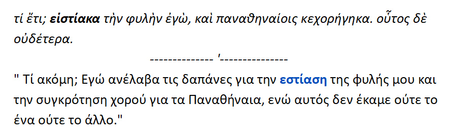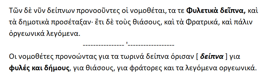 Οι νομοθέτες λοιπόν προνοώντας για τα δείπνα , όρισαν και τα φυλετικά δείπνα και τα δημοτικά ακόμη για τους θιάσους [δείπνα] και τα Φρατρικά [ δείπνα για τις φρατρίες] και τα λεγόμενα οργεωνικά δείπνα { = εστίασις ,ευωχία των οργεώνων}. Οργε[ι]ών = εκλεγμένος πολίτης , ο οποίος σε καθορισμένους καιρούς όφειλε να τελεί κάποιες ιδιαίτερες θυσίες υπέρ των δικών του συμφυλετών.