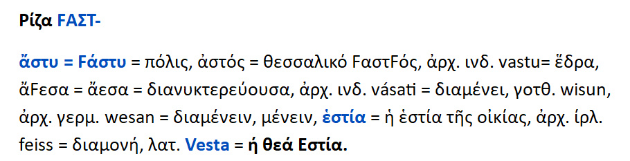 ρ.[ FΑΣΤ -] . Fάστυ = άστυ =πόλις .FαστFος = αστός .Vastu = έδρα . αFω [ > αύω ],ιαύω { ι +αύω } = διανυκτερεύω / αFεσα > άεσα = διανυκτερεύουσα . Η εστία = η εστία της οικίας .Vesta = η θεά Εστία.