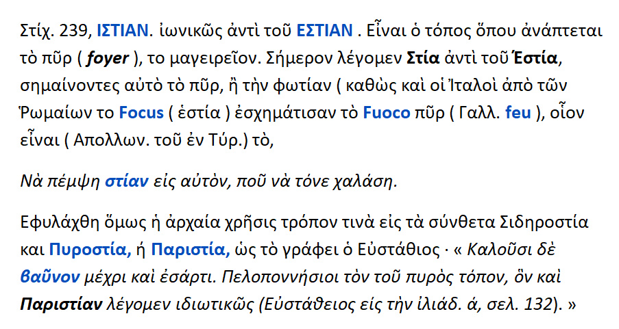Ιστία αντί του Εστία .Είναι ο τόπος που ανάπτεται το πυρ { foyer }, το μαγειρείον .Σήμερα λέμε Στία αντί του Εστία με την σημασία του πυρός ή της φωτιάς. Όπως οι Ιταλοί σχημάτισαν το fuoco { =πυρ } από το Focus {= εστία } των Λατίνων.