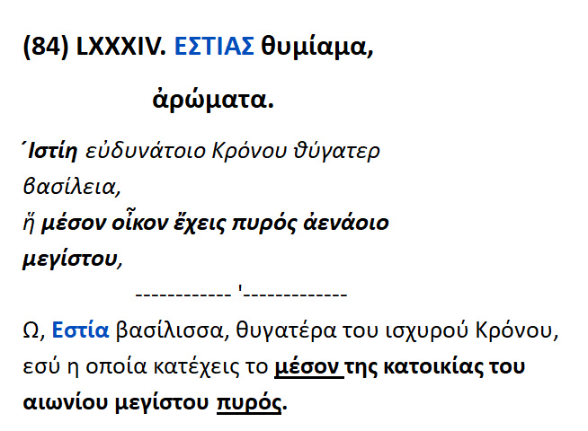 Εστίας θυμίαμα . Η Ιστία κατέχει το μέσον του οίκου του μεγίστου πυρός που ρέει ες αεί.