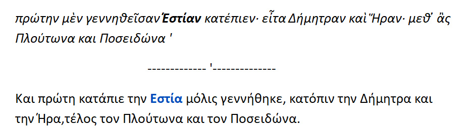 Και κατάπιε ο Κρόνος την πρωτότοκη Εστία μόλις γεννήθηκε .