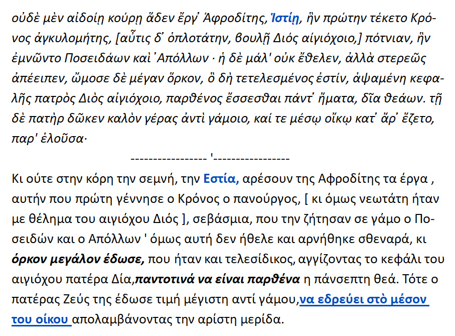 ».. κι όρκον μεγάλον έδωσε, που ήταν και τελεσίδικος,παντοτινά να είναι παρθένα η πάνσεπτη θεά. Τότε ο πατέρας Ζεύς της έδωσε τιμή μεγίστη αντί γάμου ,να εδρεύει στο μέσον του οίκου .. »