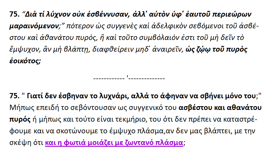 Μήπως επειδή το σεβόντουσαν ως συγγενικό του ασβέστου και αθανάτου πυρός ή μήπως και τούτο είναι τεκμήριο ,του ότι δεν πρέπει να καταστρέφουμε και να σκοτώνουμε το έμψυχο πλάσμα ,αν δεν μας βλάπτει, με την σκέψη ότι και η φωτιά μοιάζει με ζωντανό πλάσμα ;