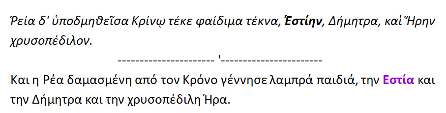 Εστία ,η πρωτότοκος . Η Ρέα δμηθείσα { < δαμάω/ δαμάζω > δμωή = δούλα ,δαμασμένη ,εξημερωμένη } από τον Κρόνο έτεκε {< τίκτω } τέκνα ένδοξα { φαίδιμα < φαίνω =λάμπω}.
