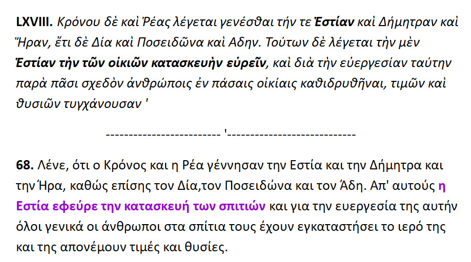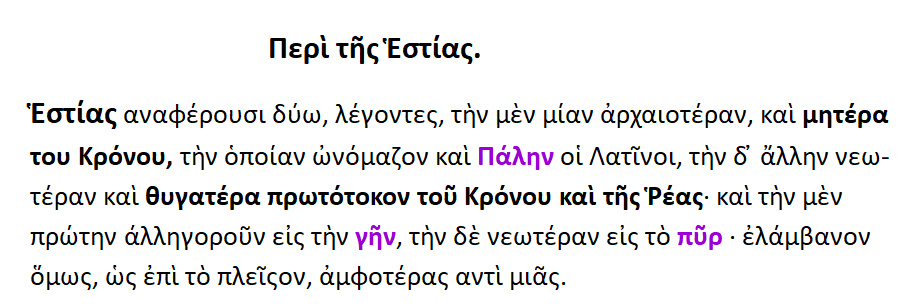 Εστία = μητέρα Γη . Eστία δε σένα { δηλ. την Γην } ονομάζουν οι σοφοί από τους θνητούς ,διότι κάθεσαι { μένεις ακίνητη } στον αιθέρα.