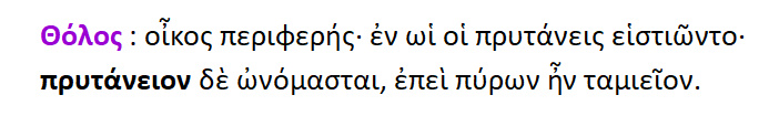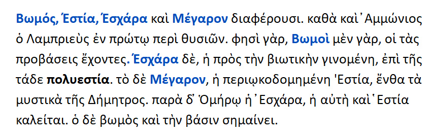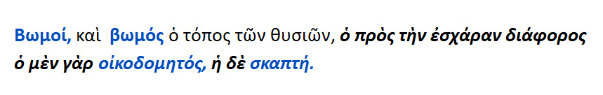 Βωμοί : αυτοί που έχουν τις προσβάσεις [= προσαναβάσεις ].Εσχάρα : αυτή που γίνεται προς βιωτική χρήση επί της γης { προς εξυπηρέτηση των βιοτικών αναγκών }.Τα δε πολυτελή ονομάζονται εστίες. Μέγαρον : η περιοικοδομημένη εστία.Στον όμηρο η Εσχάρα και αυτή Εστία καλείται. Ο δε βωμός και βάση σημαίνει.