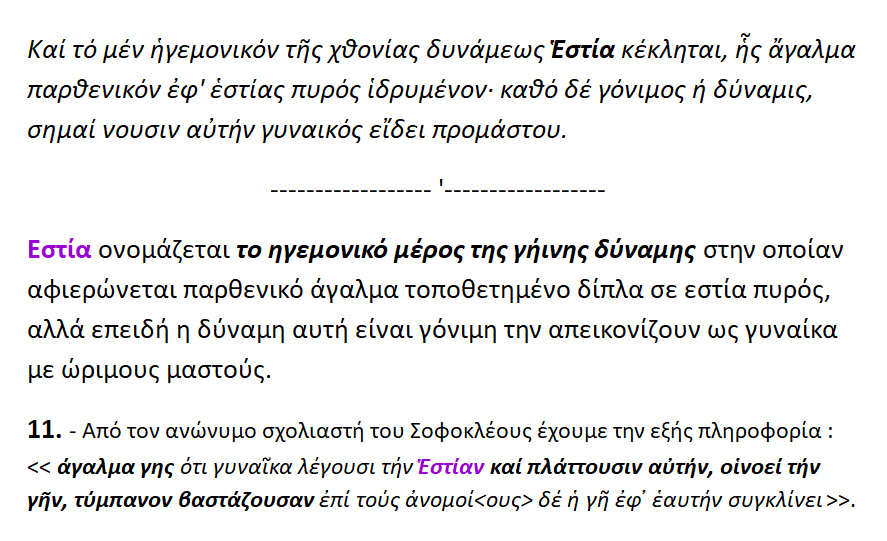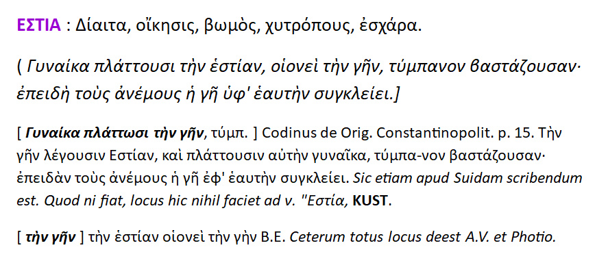 Εστία : δίαιτα ,οίκησις ,βωμός ,χυτρόπους εσχάρα…Την γην ονομάζουν Εστία και την πλάθουν [ οι καλλιτέχνες ] γυναίκα ,η οποία βαστάζει τύμπανον. [Επειδή η γη έχει την ικανότητα βάζει μαζί [;], να ελέγχει τους ανέμους ].