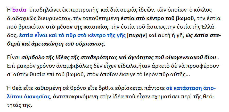 Την Εστία την τοποθετούσαν στο κέντρο της κατοικίας και όχι ,όπως αργότερα συνέβη ,στην άκρη της αίθουσας.…Οι Πυθαγόρειοι όταν έλεγαν Εστίαν, εννοούσαν την άπειρη φωτιά ,το αιώνιο πυρ ,που βρίσκεται στο ΚΕΝΤΡΟΝ ΤΟΥ ΚΟΣΜΟΥ και την παρίσταναν όπως την Κυβέλη ,που κρατούσε ΤΥΜΠΑΝΟΝ στα χέρια της .