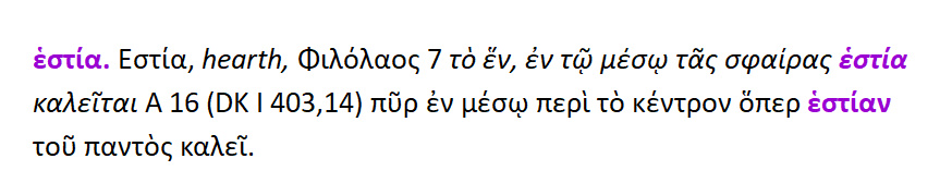 Hearth = εστία ,τζάκι. Φιλόλαος : το ένα ,στο μέσον της σφαίρας ,εστία ονομάζεται . Πυρ στο μέσον πέριξ του κέντρου , αυτό ακριβώς εστία του παντός ονομάζεται.