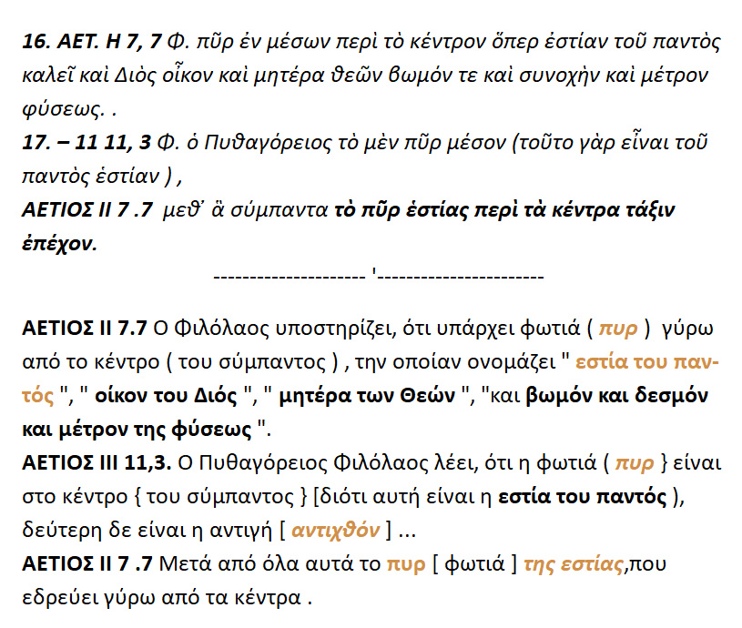 Ο Φιλόλαος υποστηρίζει ,ότι υπάρχει φωτιά { πυρ } πέριξ του κέντρου ,την οποίαν ονομάζει ‘‘ εστία του παντός ‘‘.