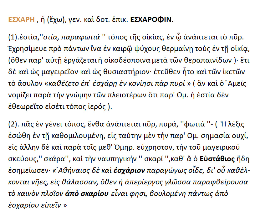 Εσχάρα { < έσχον < έχω } : 1. εστία, στία, παραφωτιά , τόπος της οικίας ,στον οποίον ανάπτεται το πυρ .Χρησίμευε προ πάντων για να ζεσταίνει τους οικείους σε καιρό ψύχους ,ακόμη δε ως μαγειρείον και ως θυσιαστήριον , από εδώ ήταν και το άσυλο των ικετών ,που καθόταν [ο ικέτης] επί της εσχάρας στις στάχτες κοντά στη φωτιά 2. γενικά κάθε τόπος ,όπου ανάπτεται πυρ ,πυρά,’φωτιά’ .Η λέξη σώθηκε μέχρι τις ημέρες μας στις λέξεις ‘σκάρα’ { μαγειρικόν σκεύος } και ‘σκαρί’ { ναυπηγική }.