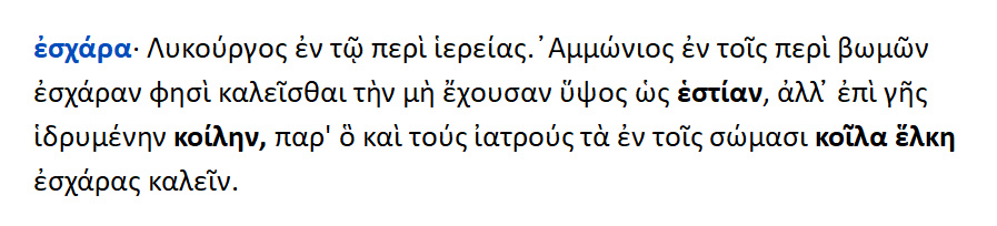 Εσχάρα καλείται η μη έχουσα ύψος ,ως εστίαν , αλλά επί γης ιδρυμένη κοίλην. Εσχάρες καλούνται στην Ιατρική τα κοίλα έλκη των σωμάτων.