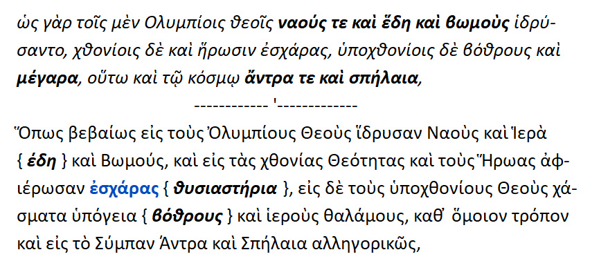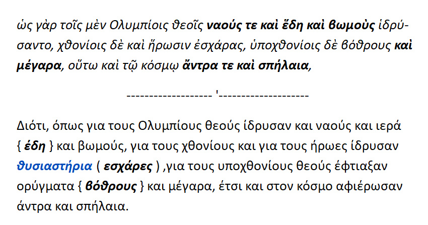 Για τους Ολυμπίους θεούς ίδρυσαν ναούς ,ιερά και βωμούς .Για τους χθονίους και τους ήρωες ίδρυσαν εσχάρες [ θυσιαστήρια ] .Για τους υποχθονίους κατασκεύασαν βόθρους και μέγαρα {;}.