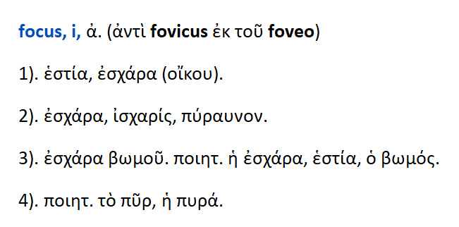 focus < fovicus < foveo . Foveo – fovi -fotum fovere : θάλπω ,θερμαίνω ,αναζωπυρώνω .Θεραπεύω ,επιμελούμαι, τρέφω.