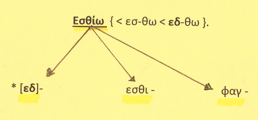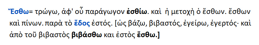 Εσθίω = Τρώγω, καταπίνω, καταβροχθίζω. Από ρίζα { ΕΔ –} > [ εδ-θω ] εσθ +ω > εσθ-j+ω { εδ- ,εδη- }. ΠΑΡΑΓ. : εδωδή, εδώδιμος, έδεσμα, φαγητόν, φαγώσιμος. ΣΥΝΤ. : εσθίω + αιτ. =τρώγω κάτι.