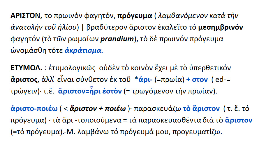 Άριστον = το πρωινό φαγητό ,το πρόγευμα ,λαμβανόμενον κατά την ανατολή του ηλίου. Αργότερα άριστον λεγόταν το μεσημβρινό φαγητό .Το δε πρωινό πρόγευμα ονομάστηκε τότε ακράτισμα. ΕΤΥΜΟΛΟΓΙΑ : το άριστον ουδέν το κοινόν έχει με το υπερθετικόν άριστος-η-ον { < αγαθός } ,αλλά είναι σύνθετον από το { άρι {=πρωί } + εστόν { < έδω }. Άριστον = το τρωγόμενον το πρωινό. Αριστοποιέω = { άριστον + ποιέω } = παρασκευάζω πρωινόν , προγευματίζω.