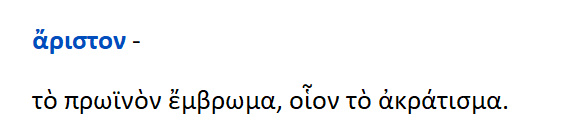 Άριστον = το πρωινόν έμβρωμα {= κολατσιό,δάγκωμα } ,όπως το ακράτισμα.