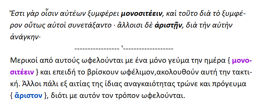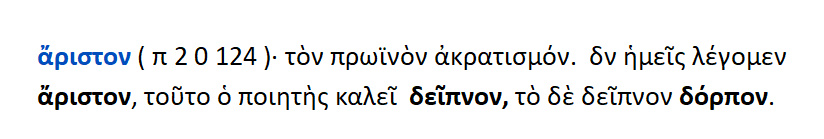 Άριστον = ο πρωινός ακρατισμός {= τεμάχιον άρτου εμβαπτισμένου εις οίνον }.Τούτο ο ποιητής καλεί δείπνον ,το δε δείπνον καλεί δόρπον.