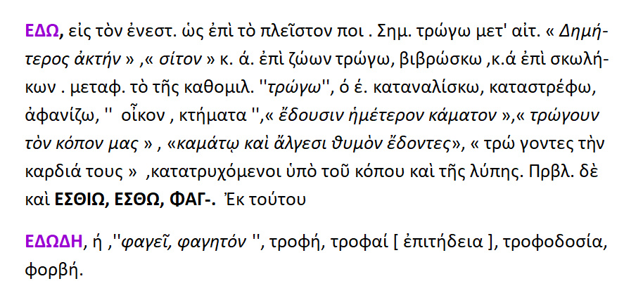 ἐσθίω : 1. τρώω, Λατ. edo [ἔδω ] 2. ἔσθω :καταβροχθίζω, καταναλώνω την περιουσία. 3.ἔδω { αντί ἐσθίω} : τρώω, καταβροχθίζω 4.φᾰγεῖν :{ < ἔφαγον, αόρ. βʹ του ἐσθίω } =τρώω, καταβροχθίζω, σπαταλώ.