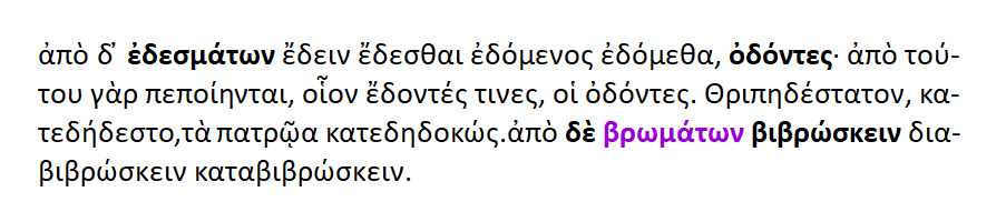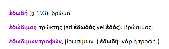 Από τα εδέσματα : έδειν ,έδεσθαι,εδόμενος εδόμεθα, οδόντες ,διότι από αυτό [το έδω ] οι οδόντες ,κατά κάποιον τρόπον είναι »έδοντες». Άβρωτος = νήστις [νηστικός], Αβρωσία = η ασιτία.