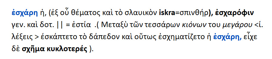 Εσχάρη : εστία στην οικία σε ορισμένη θέση ,η οποία ,όπως φαίνεται ,ήταν κάποιο στρογγυλό κοίλωμα του εδάφους . Οικία του Οδυσσέως : C = μέγαρον , f = εσχάρη , g = κίονες.