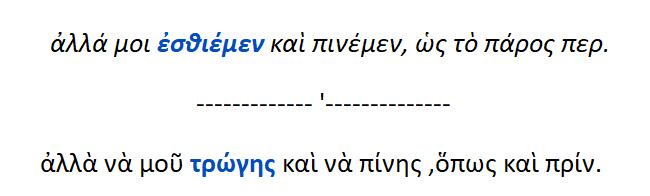 Ρήματα όμοια σχετικά με το »τρώγω » : 1.Εσθίω . 2. Έδω . 3. Τρώγω . 4. Πατέομαι .Πατέω-πατώ .5. Έφαγον 6. Σιτέομαι. 7. Βιβρώσκω . 9.Δειπνώ 10.Αριστάω . 11. Ακρατίζομαι . 12. Δορπέω .