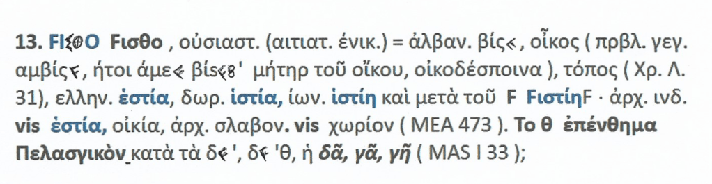 Εστία. FΙΣΘΟ { fισθο } = vis { domus }= οίκος { Fοίκος } = vicus > wick { Painwick }. { Αμβίς { άμε + βις } = η μητέρα του οίκου ,η οικοδέσποινα , η εστία { ιστία / ιστίη /Fιστίη ,Vesta },vis = εστία ,οικία ,χωρίον.