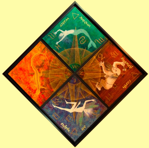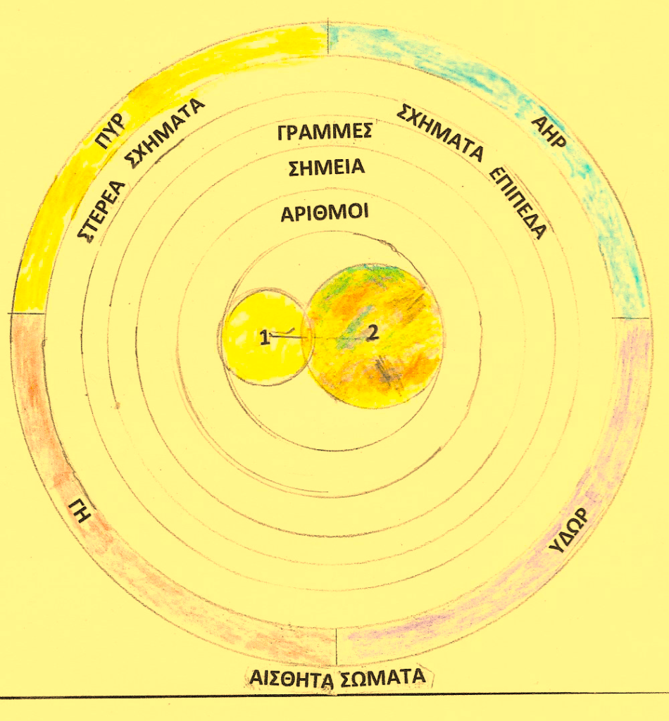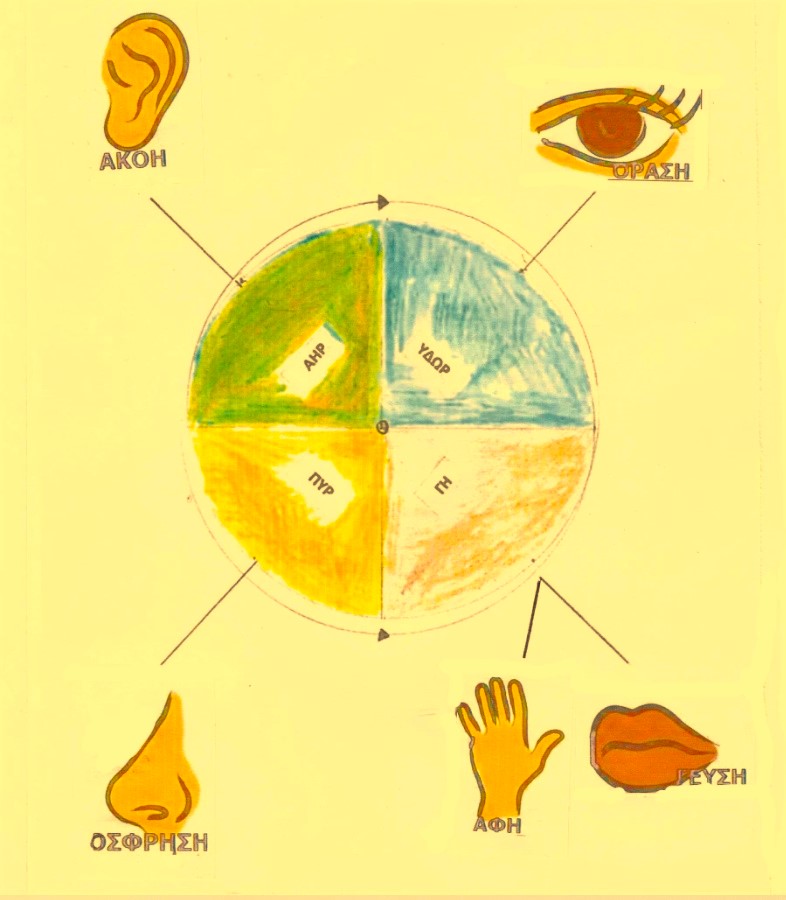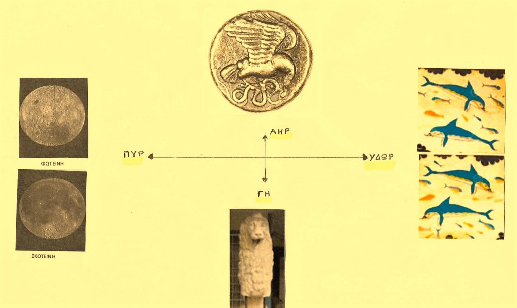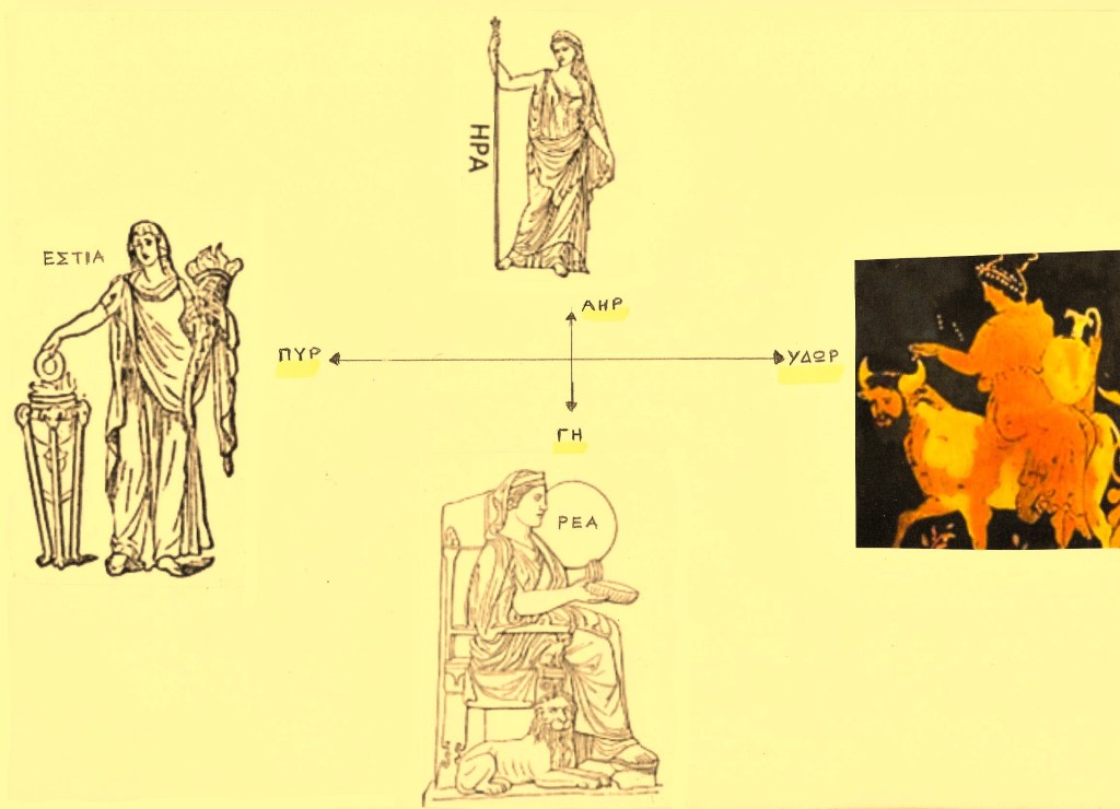 Τα τέσσερα στοιχεία είναι η : η Γη ,το Ύδωρ ,το Πυρ και ο Αήρ. Και την Γην ζωγράφιζαν ως την Ρέαν,το Πυρ ως την Εστίαν ,το Ύδωρ ως κάποια Να’ι’άδα Νύμφη και τον Αέρα ως την Ήραν.
