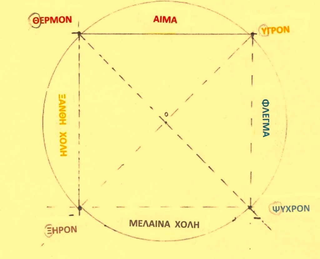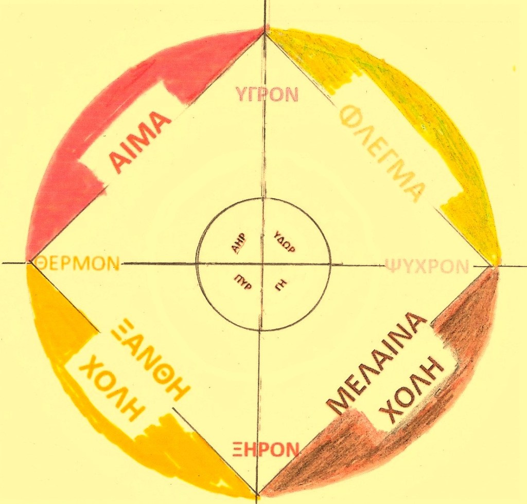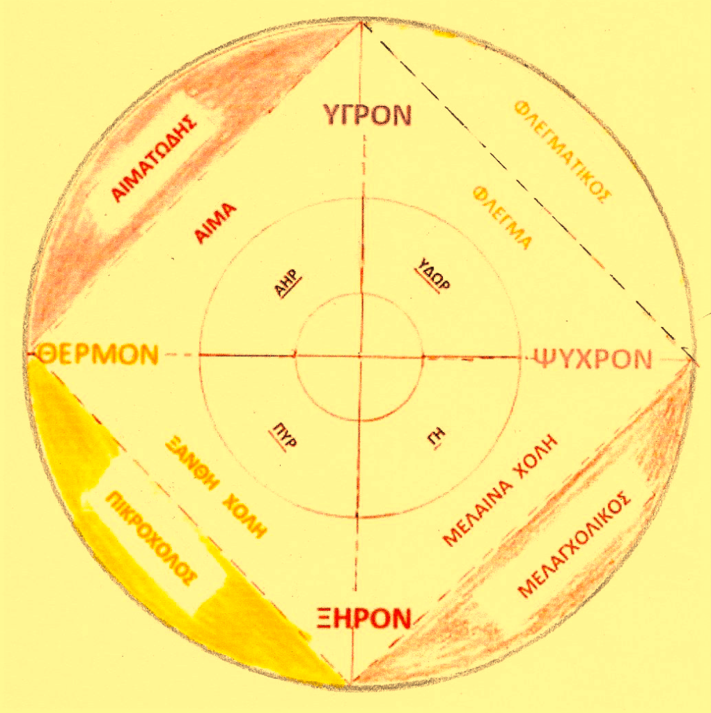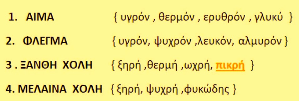 Αν η ψυχρή μέλαινα χολή βρίσκεται σε υπερβολική ποσότητα στο σώμα ,προξενεί αποπληξία ,νάρκη ,αθυμία ,φοβίες .Αν υπερθερμανθεί προξενεί ,ευθυμία με ή χωρίς τραγούδια,έκσταση και εξανθήματα…. Πρέπει δε τα στοιχεία να είναι αμοιβαίως »ποιητικά’‘ [ όταν ποιεί κάτι το ένα στο άλλο ] και »παθητικά» [ όταν παθαίνει κάτι,το ένα από το άλλο] ‘ διότι αναμειγνύονται [ τα στοιχεία ] και μεταβάλλονται[ από το ένα στοιχείο στο άλλο ]. Όμως το θερμό με το ψυχρό και το υγρό με το ξηρό ,λαμβάνουν τα ονόματά τους ,επειδή το πρώτο ζεύγος στοιχείων είναι »ποιητικόν » και το δεύτερο ζεύγος στοιχείων ,επειδή είναι »παθητικόν ».