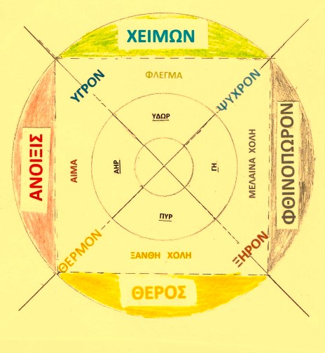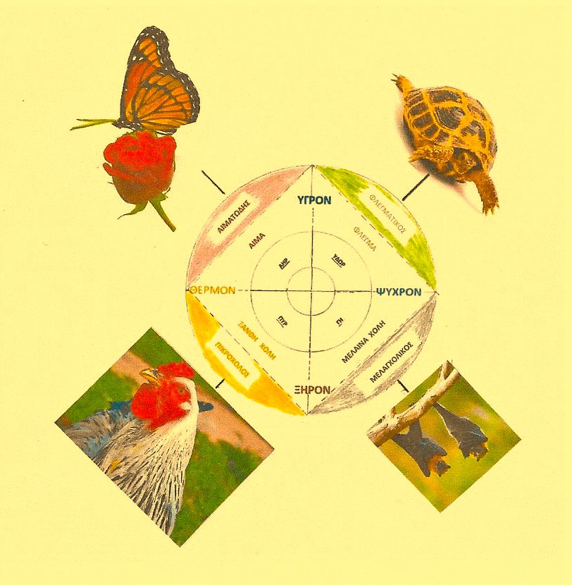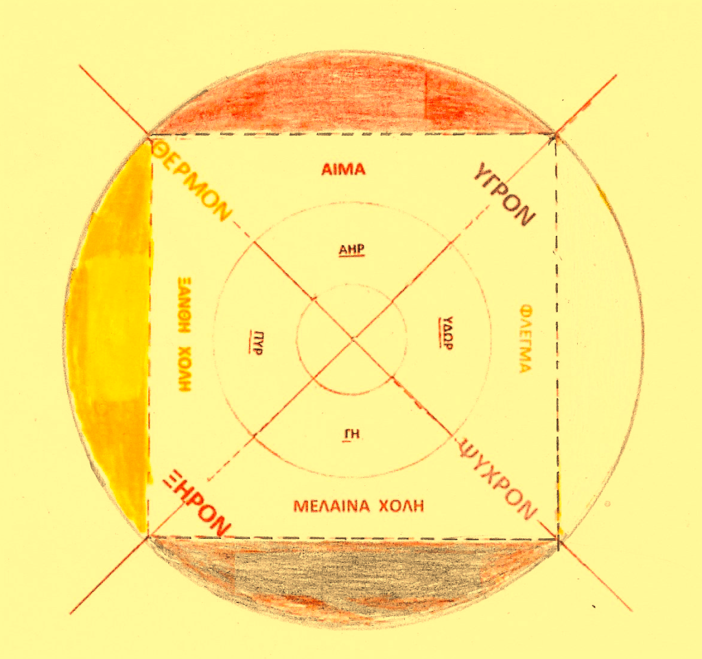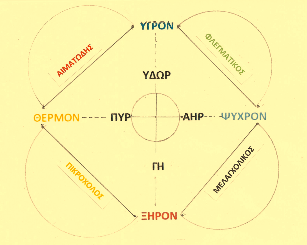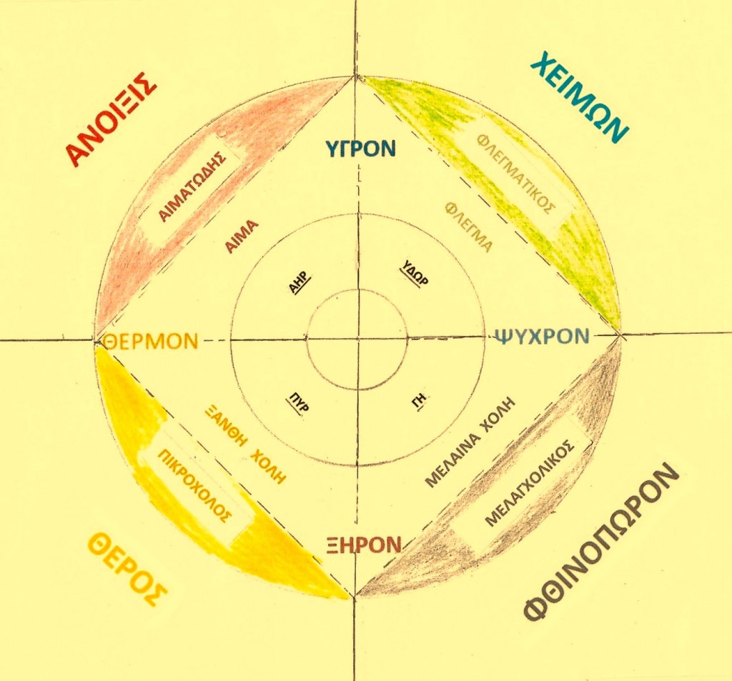 Αν η ψυχρή μέλαινα χολή βρίσκεται σε υπερβολική ποσότητα στο σώμα ,προξενεί αποπληξία ,νάρκη ,αθυμία ,φοβίες .Αν υπερθερμανθεί προξενεί ,ευθυμία με ή χωρίς τραγούδια,έκσταση και εξανθήματα…. Πρέπει δε τα στοιχεία να είναι αμοιβαίως »ποιητικά’‘ [ όταν ποιεί κάτι το ένα στο άλλο ] και »παθητικά» [ όταν παθαίνει κάτι,το ένα από το άλλο] ‘ διότι αναμειγνύονται [ τα στοιχεία ] και μεταβάλλονται[ από το ένα στοιχείο στο άλλο ]. Όμως το θερμό με το ψυχρό και το υγρό με το ξηρό ,λαμβάνουν τα ονόματά τους ,επειδή το πρώτο ζεύγος στοιχείων είναι »ποιητικόν » και το δεύτερο ζεύγος στοιχείων ,επειδή είναι »παθητικόν ».