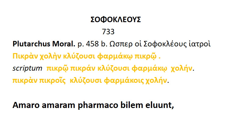 Από αυτά τα πράγματα ,μου φαίνεται ,ότι κι ο ίδιος ταράζεσαι πάρα πολύ , όπως ακριβώς οι ιατροί που αναφέρει ο Σοφοκλής ,που με ομοιοπαθητικό τρόπο θεραπεύουν τις νόσους και ‘‘ με τα πικρά τους φάρμακα καθαρίζουν την πικρή χολή »,έτσι κι συ, με τέτοια» ομοιο-παθητική »μέθοδο τρόπον τινά, αντι-χαλεπαίνεις και συμ-πικραίνεσαι για τα πάθη και τα νοσήματα των ανθρώπων αυτών, το οποίο βεβαίως δεν είναι εύλογο [ άρα παράλογο ].