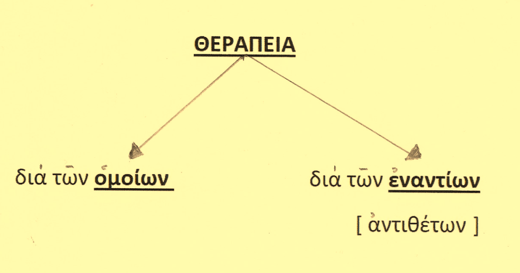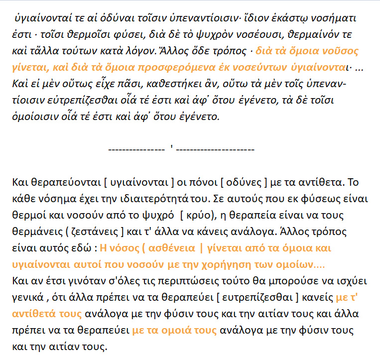 ..,ότι άλλα πρέπει να τα θεραπεύει κανείς με τ’ αντίθετά τους ανάλογα με την φύσιν τους και την αιτίαν τους και άλλα πρέπει να τα θεραπεύει με τα όμοιά τους ανάλογα με την φύσιν τους και την αιτίαν τους.