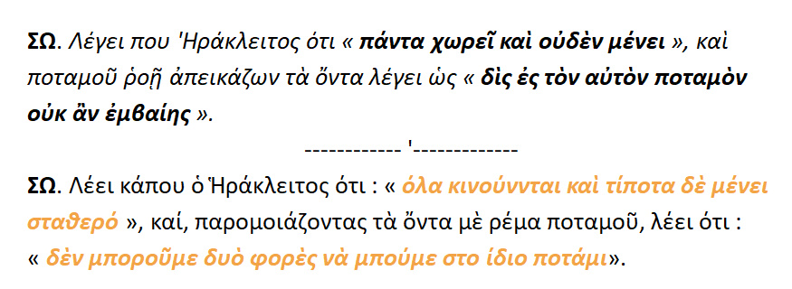 << Δις ες τον αυτόν ποταμόν ουκ αν εμβαίης .Στον ίδιον και τον αυτόν ποταμόν δεν μπορείς να μπεις δύο φορές . Καθ’ότι τα νερά είναι τρεχούμενα και συνεχώς ανανεώ-νονται .Άρα ο ποταμός είναι ίδιος ,τα νερά διαφορετικά κάθε φορά.