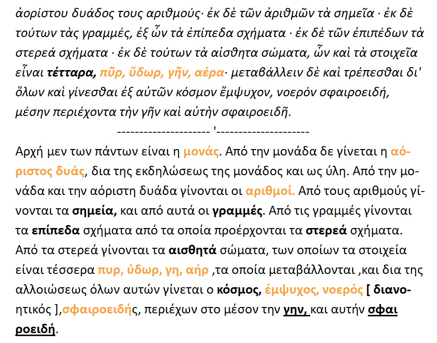 Αρχή των πάντων είναι η μονάδα. Από την μονάδα γίνεται η αόριστη δυάδα με την εκδήλωσή της και ως ύλη. Από την μονάδα και την αόριστη δυάδα γίνονται οι αριθμοί. Από τους αριθμούς γίνονται τα σημεία. Από τα σημεία γίνονται οι γραμμές .Από τις γραμμές γίνονται τα επίπεδα σχήματα .Από τα επίπεδα σχήματα γίνονται τα στερεά σχήματα . Από τα στερεά σχήματα γίνονται τα αισθητά σώματα , των οποίων τα στοιχεία είναι τέσσερα : πυρ, ύδωρ, γη , αήρ , τα οποία μεταβάλλονται και με την αλλοίωση όλων αυτών γίνεται ο κόσμος ,έμψυχος ,νοερός και σφαιροειδής.