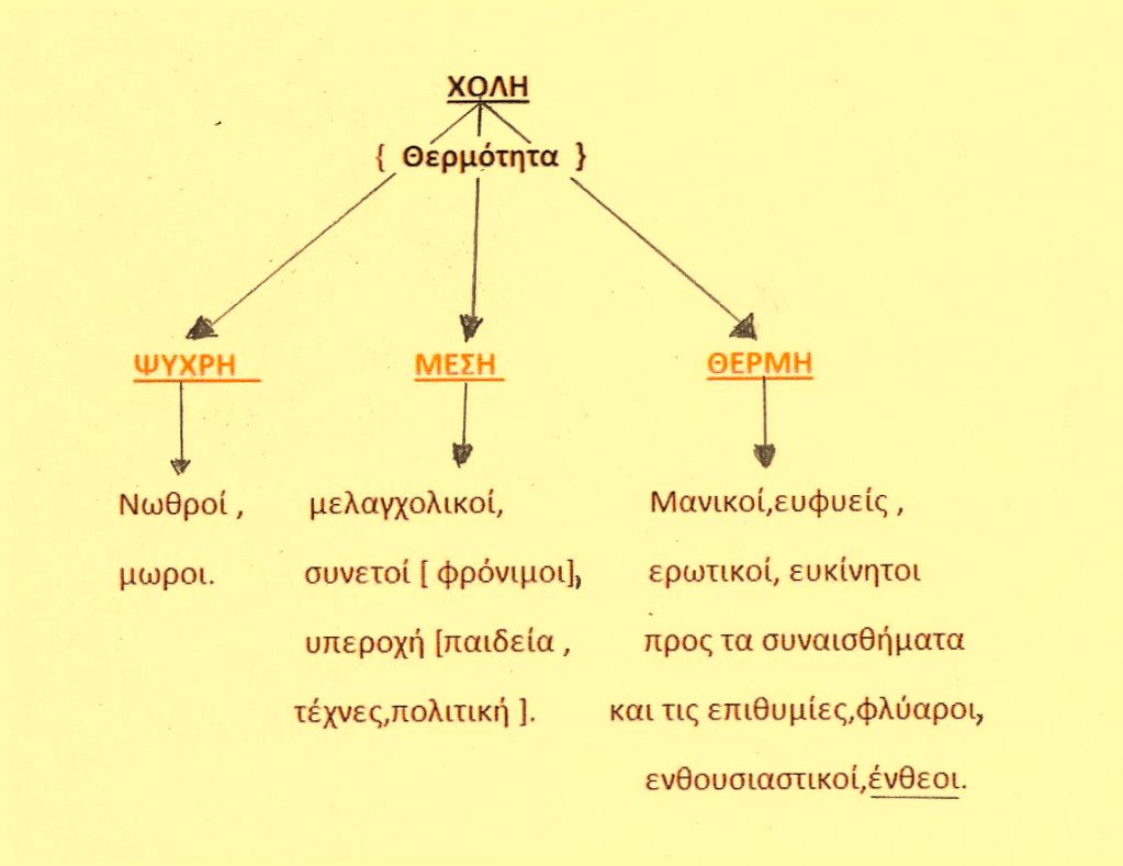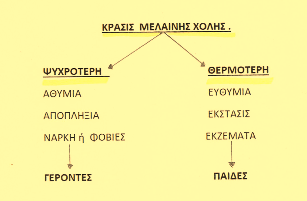 ..{ ας πούμε } ότι ο εν λόγω χυμός , ο μελαγχολικός ,είναι ήδη αναμεμειγμένος από την φύση ,διότι είναι κράμα θερμού και ψυχρού ‘ επειδή από τούτα τα διπλά στοιχεία έχει συσταθεί η φύσις..Γι’ αυτόν τον λόγον και η μέλαινα χολή και πάρα πολύ θερμή και πάρα πολύ ψυχρή γίνεται. Διότι το ίδιο πράγμα εκ φύσεως έχει γεννηθεί αυτά να παθαίνει [ δηλ. να γίνεται ] και από το ένα και από το άλλο [ και θερμόν και ψυχρόν ].