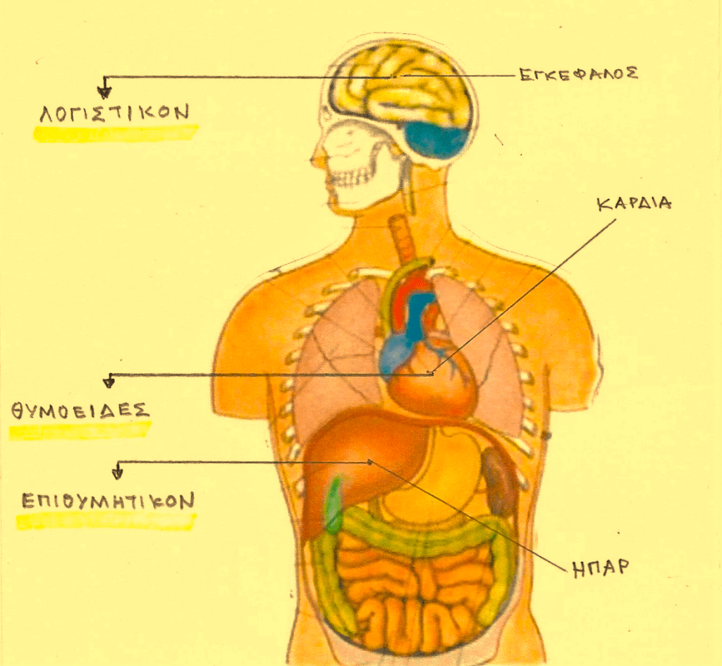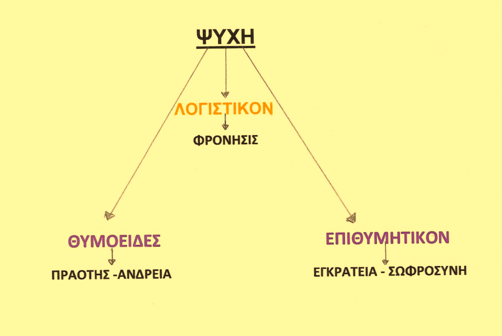 1.Επιθυμία { επί +θυμός } : » δύναμις επί τον θυμόν ιούσα ‘‘ =ορμητική δύναμη που εναντιώνεται στο θυμικόν [ θυμοειδές ] ,που θέλει να του επιβληθεί με σκοπό την κάλυψη μιας ανάγκης { αληθινής ή ψεύτικης }ή ενός ελλείμματος { αληθινού ή ψεύτικου }Η Επιθυμία είναι άλογος .Είναι ο μαύρος ίππος του άρματος της ψυχής ,ο οποίος μαστιγώνεται από τον Ηνίοχον { λογικόν } για να υπακούσει ,καίτοι δύσκολο. Είναι επίσης η Λερναία ύδρα ,το νερόφιδο με τα πολλά κεφάλια { =επιθυμίες } 2.Θυμός { < θύω } : » θύσις και ζέσις της ψυχής »= από την ταραχή { θύσις ] και από το βράσιμο { ζέση < ζέω = βράζω }.