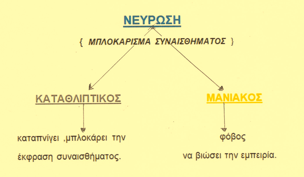 Η νεύρωσις είναι μία παθολογική κατάσταση της ύπαρξής μας ,που έχει ως κύριο χαρακτηριστικό της την ένταση. Η νευρωτική ένταση προέρχεται από κάποιον απωθημένο Πόνο { Πρωτογενής Πόνος } ,ο οποίος έχει προέλευση είτε σωματική είτε ψυχολογική .Το να είναι κάποιος μανιακός σημαίνει ότι δεν θέλει να βιώσει τα συναισθήματά του . Το να είναι κάποιος καταθλιπτικός σημαίνει ότι έχει καταπνίξει και συμπιέσει μέσα του τα συναισθήματά του [ δεν τα αφήνει να εκφραστούν ].Εκείνο που είναι παθολογικό είναι αυτό, που το μπλοκάρισμα των συναισθημάτων μας μας σπρώχνει να κάνουμε .