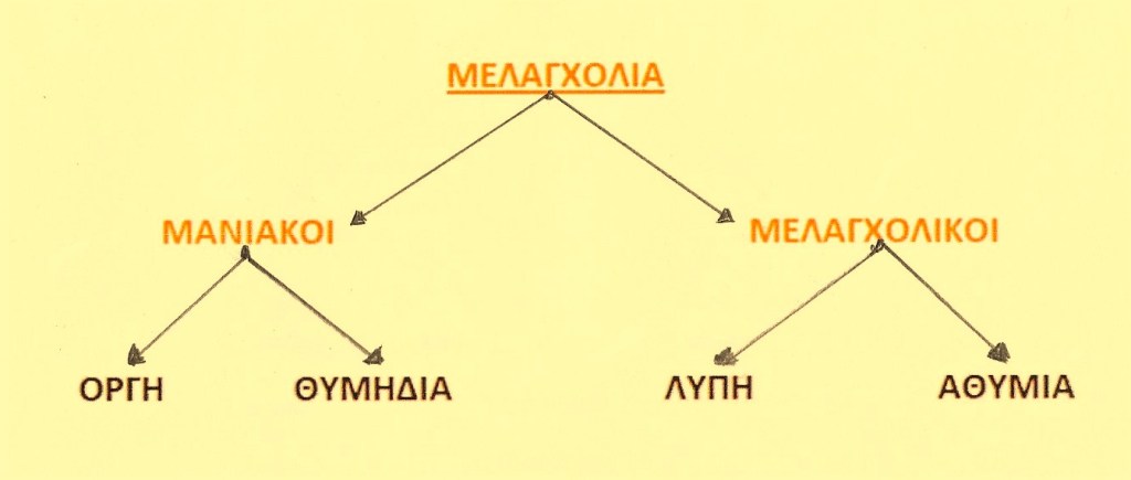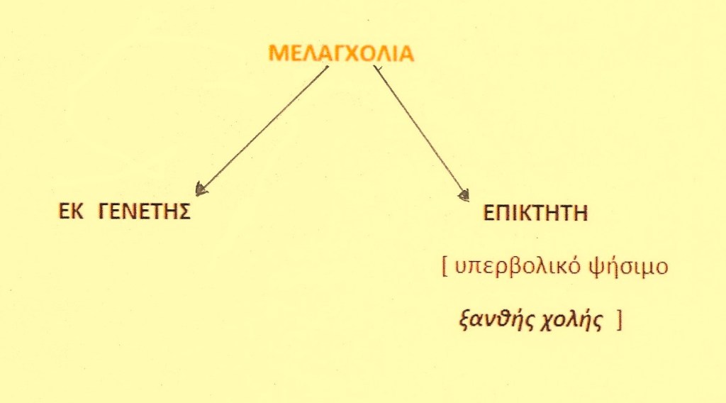 Υπάρχουν δύο είδη μελαγχολίας . Άλλοι που την έχουν εκ φύσεως και από την αρχική κράση τους και οι άλλοι , που από κακή δίαιτα απέκτησαν αργότερα αυτήν την κράση . Κράσις { < κεράννυμι : ανακατεύω δύο ή περισσότερα πράγματα, από τα οποία σχημα-τίζεται κάτι νέο σύνθετο }.Επί του προκειμένου, κράσις των χυμών του σώματος .
