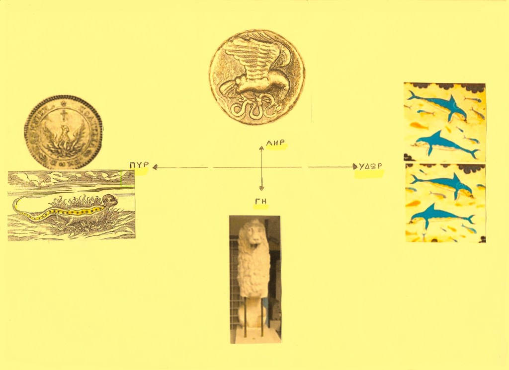 1 }. Δελφίνια,Megaron της βασίλισσας του παλατιού της Κνωσού [ fresco ] 2 }. Αετός με ένα φίδι που έχει πιάσει στα πόδια του . Αρχαίο νόμισμα Ολυμπίας Elis stater. IV αι π.Χ. 3α } .Φοίνικας ή φοίνιξ { Φοίνιξ : ήταν η πρώτη χρηματική μονάδα της Ελλάδας [1828 ] ,την εποχή του Καποδίστρια 3β }. πυροσαλαμάνδρα – Paul D Stewart » Munster Legendary Fire Salamander »[1560]. 4 }. Λέων της Αναλήψεως { Λαγκαδάς }.