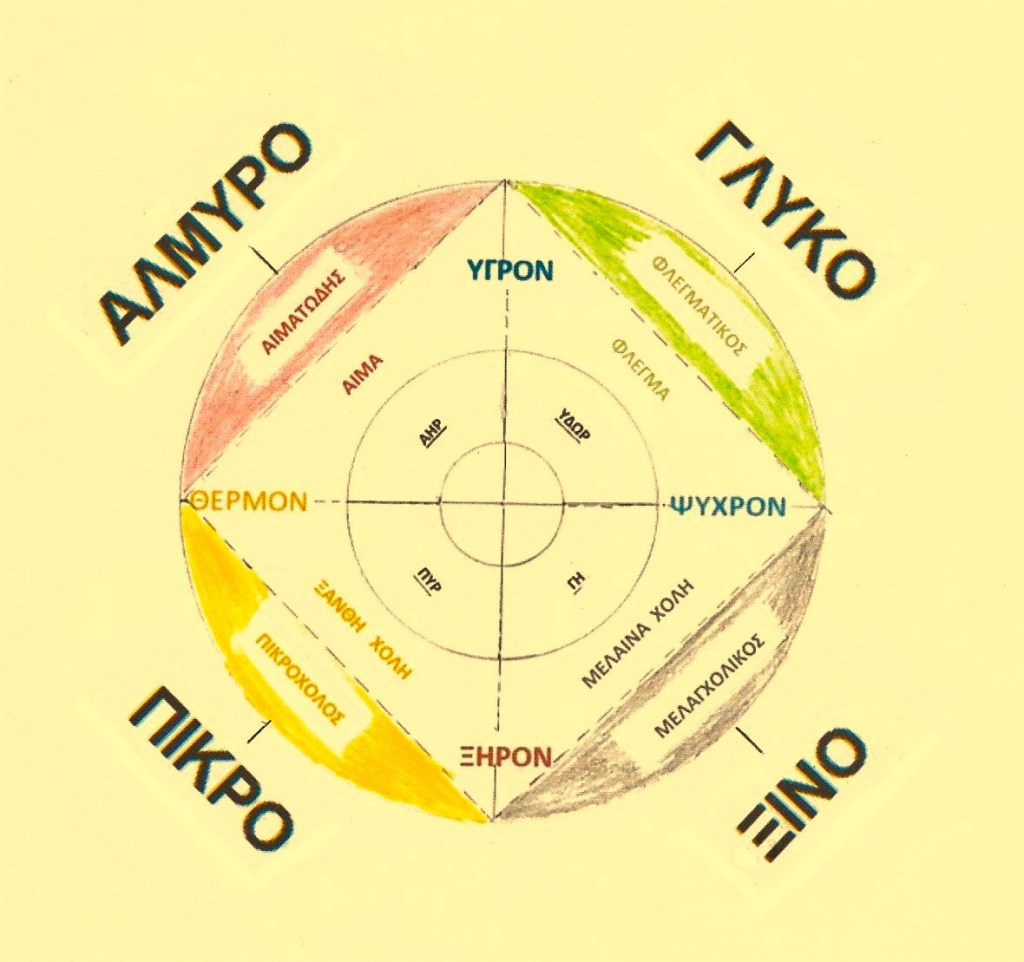 Ο Παράκελσος { 15ος αι.π.Χ. } κάνει την πρώτη αναφορά στην έννοια των τεσσάρων στοιχειωδών στοιχείων. Αυτά ήσαν : Αηρ { Sylph } , Γη { Gnome } , Πυρ { Sala-mander } , Ύδωρ (Undine). Το σώμα διαθέτει τέσσσερα είδη γεύσεως : ξινή ,γλυκιά ,πικρή ,αλμυρή.Το πικρό είναι ζεστό και ξηρό [χολερικό ] .Το ξινό είναι κρύο και ξηρό [ μελαγχολικό ].Το γλυκό είναι κρύο και υγρό [ φλεγματικό ] .Το αλμυρό είναι ζεστό και υγρό [ αιματώδες ].