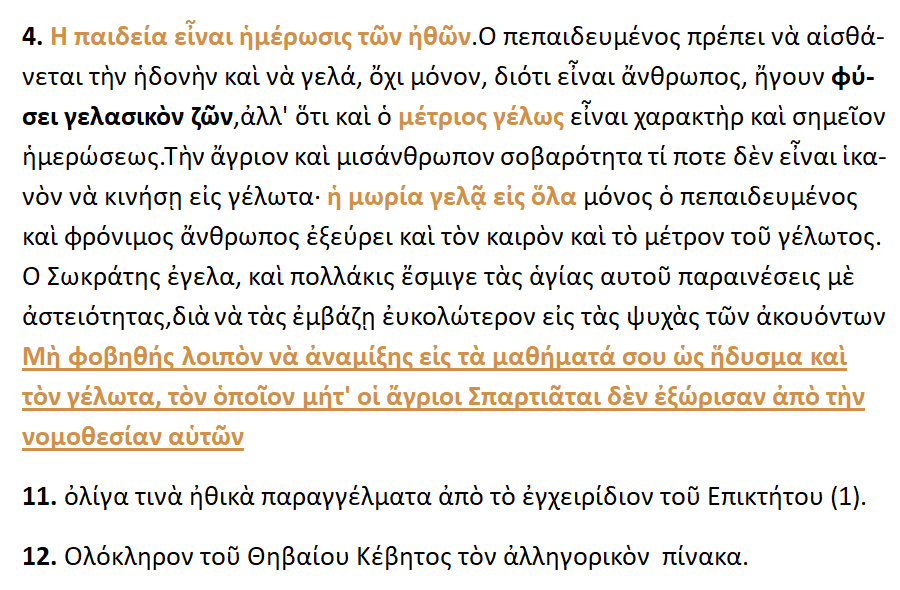 Θα πρέπει λοιπόν, να θεωρήσουμε ως απαίδευτον [ αμόρφωτον ] μεν εκείνον ,που έχει άγνοιαν »ωδής τε και ορχήσεως [ τραγουδιού και χορού ], που είναι αχόρευτος [δεν ξέρει να χορεύει] ,και να αναγνωρίσουμε ως πεπαι- δευμένο [ μορφωμένον ] ,εκείνον που ξέρει να χορεύει καλά .Αυτή είναι η πρώτη παιδεία.