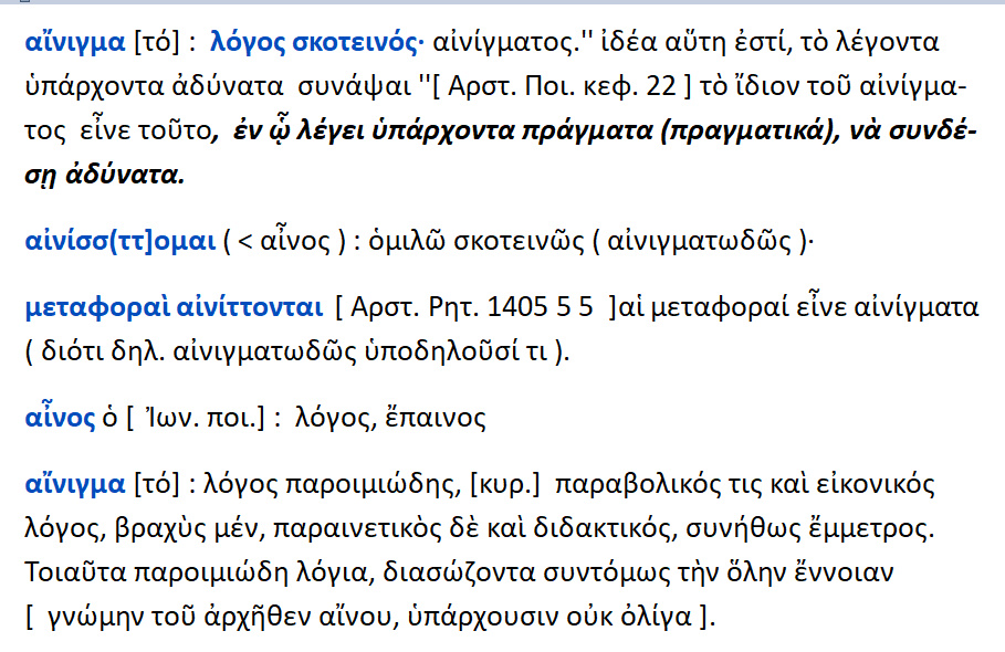 Αίνιγμα = λόγος σκοτεινός. Το ίδιον του αινίγματος είναι αυτό , ενώ λέγει κανείς πράγματα υπαρκτά ,είναι αδύνατoν να συνδεθούν. Αινίσσομαι / αινίττομαι [< αίνος ] = ομιλώ σκοτεινώς, αινιγματωδώς. Αίνος = λόγος παροιμιώδης ,παραβολικός και εικονικός ,βραχύς , παραινετικός και διδακτικός ,συνήθως έμμετρος.