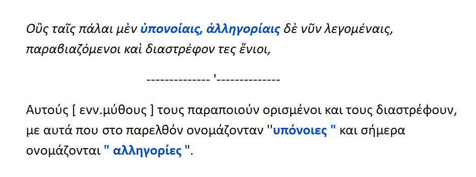 Ορισμένοι παραποιούν και διαστρέφουν τους μύθους με αυτές που στο παρελθόν ονομάζονταν »υπόνοιες »και σήμερα ονομάζονται »αλληγορίες ».