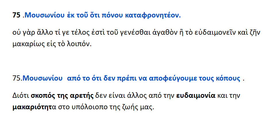 75. Μουσωνίου Ρούφου » από το ότι δεν πρέπει ν’ αποφεύγουμε τους κόπους… » Τελικός σκοπός του βίου είναι η Αρετή και η ευδαιμονία.