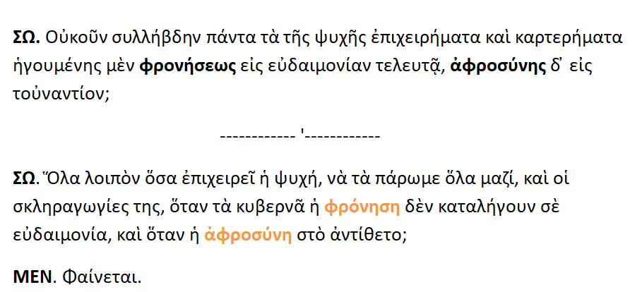 << Σε αυτό το πλαίσιο, η Αρετή της Φρονήσεως ,που είναι Αληθής Αρετή και αντίθετη με την Κακία της Αφροσύνης ,η οποία είναι Είδωλον Αρετής, τίθεται ως προϋπόθεση της Ευδαιμονίας του βίου της ενσάρκου ψυχής. Η αντίληψης αυτή ανιχνεύεται και στο έργο του Πλάτωνος » Μένων » >>.