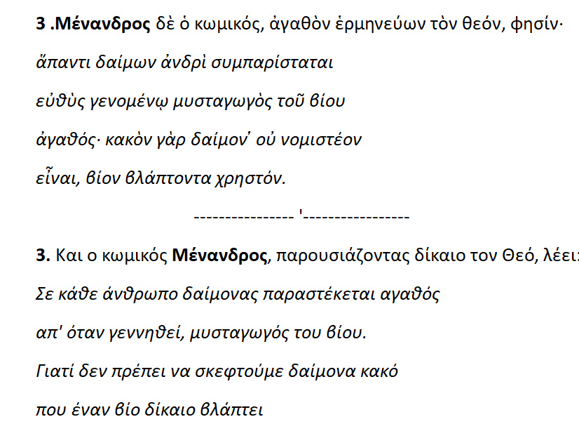 ΜΕΝΑΝΔΡΟΥ – » Σε κάθε άνθρωπο ,όταν γεννιέται παραστέκεται φύλακας-άγγελος ένας δαίμων. Κακός δαίμων δεν υπάρχει ».